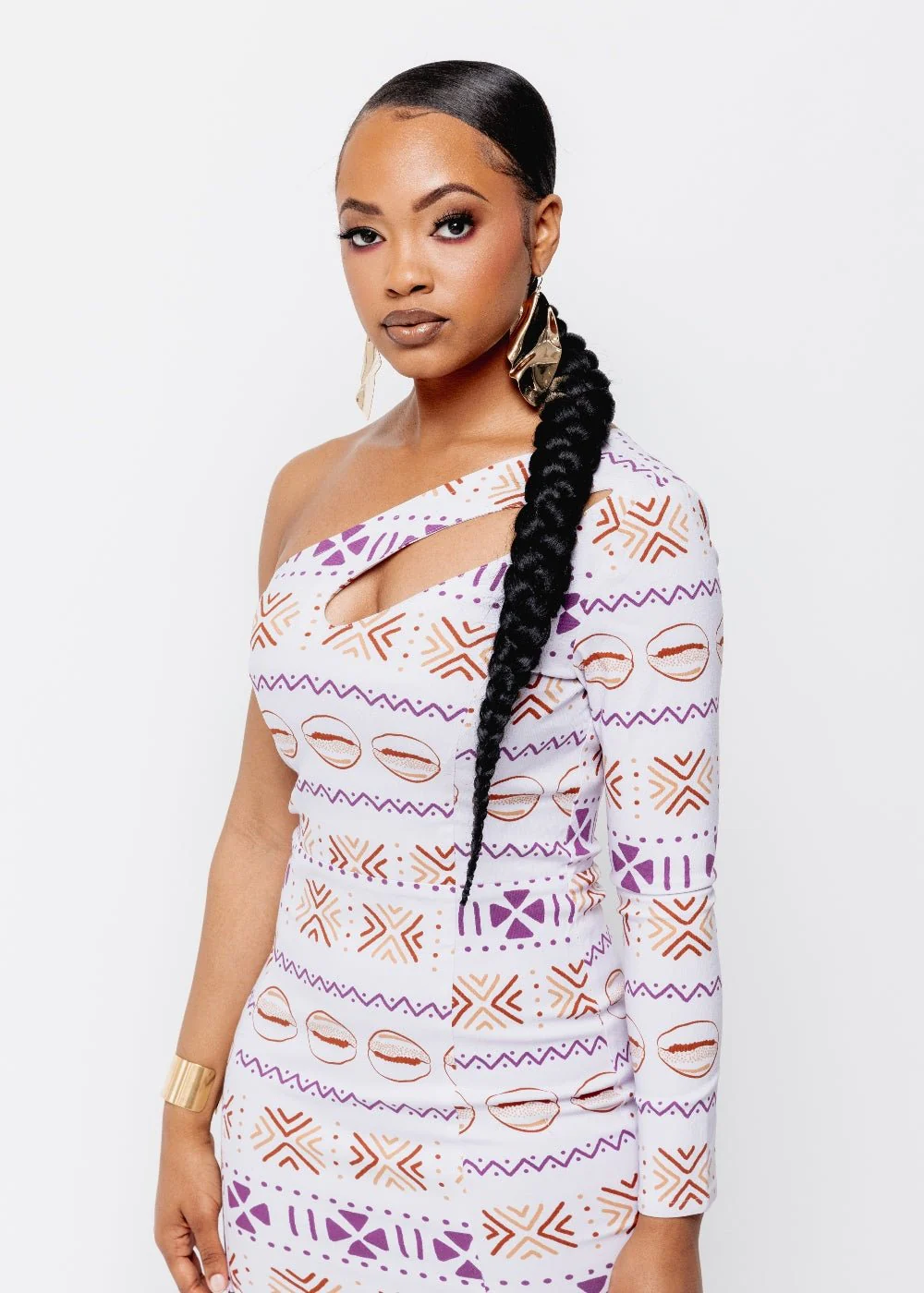 Deja Women's African Print One Stretch Shoulder Dress with Cut-Out (Mauve Plum Mudcloth) - Clearance