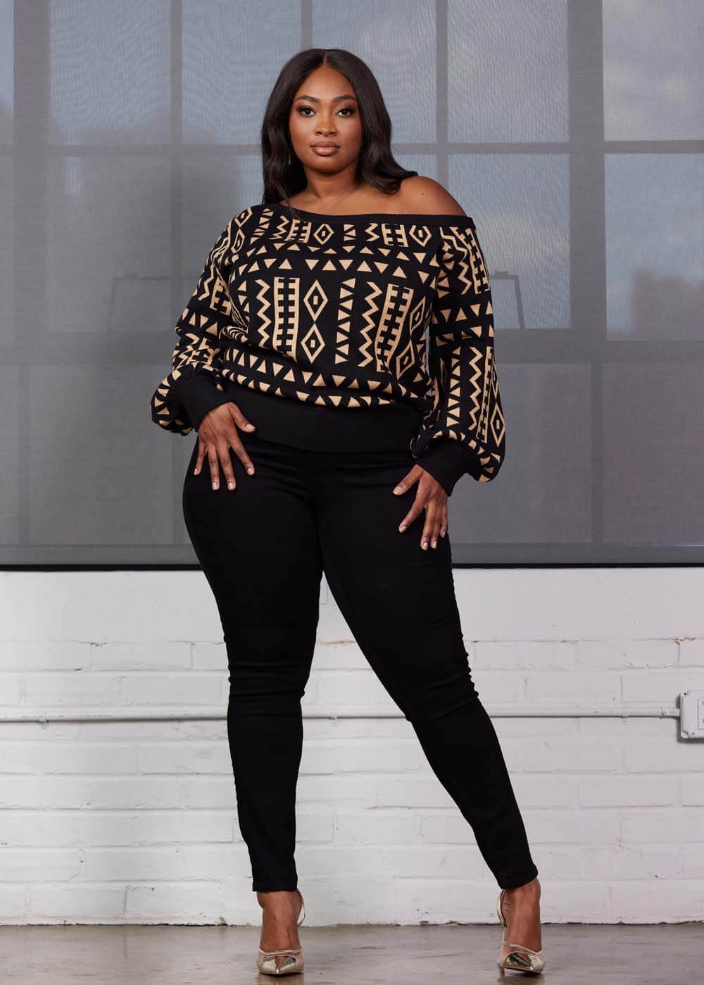 Take your look to another dimension with this unique off-the-shoulder sweater. Our Hiba sweater in the Tan Black Tribal print is a must-have this fall! Shop the matching items here.