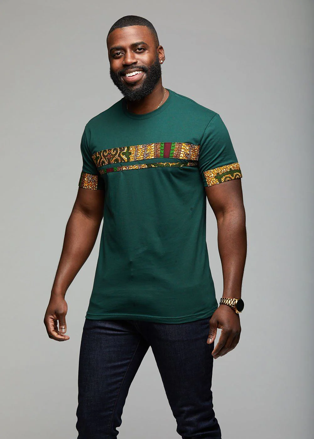 The Jaheem African Print Short Sleeve Tee (Green Tortoise Back) elevates your casual wear, creating a more sophisticated ensemble for the refined gentleman. As a transitional piece, sport the tee with a pair of jeans or dress pants. Take advantage of this multipurpose piece, as it is what your wardrobe's been missing!