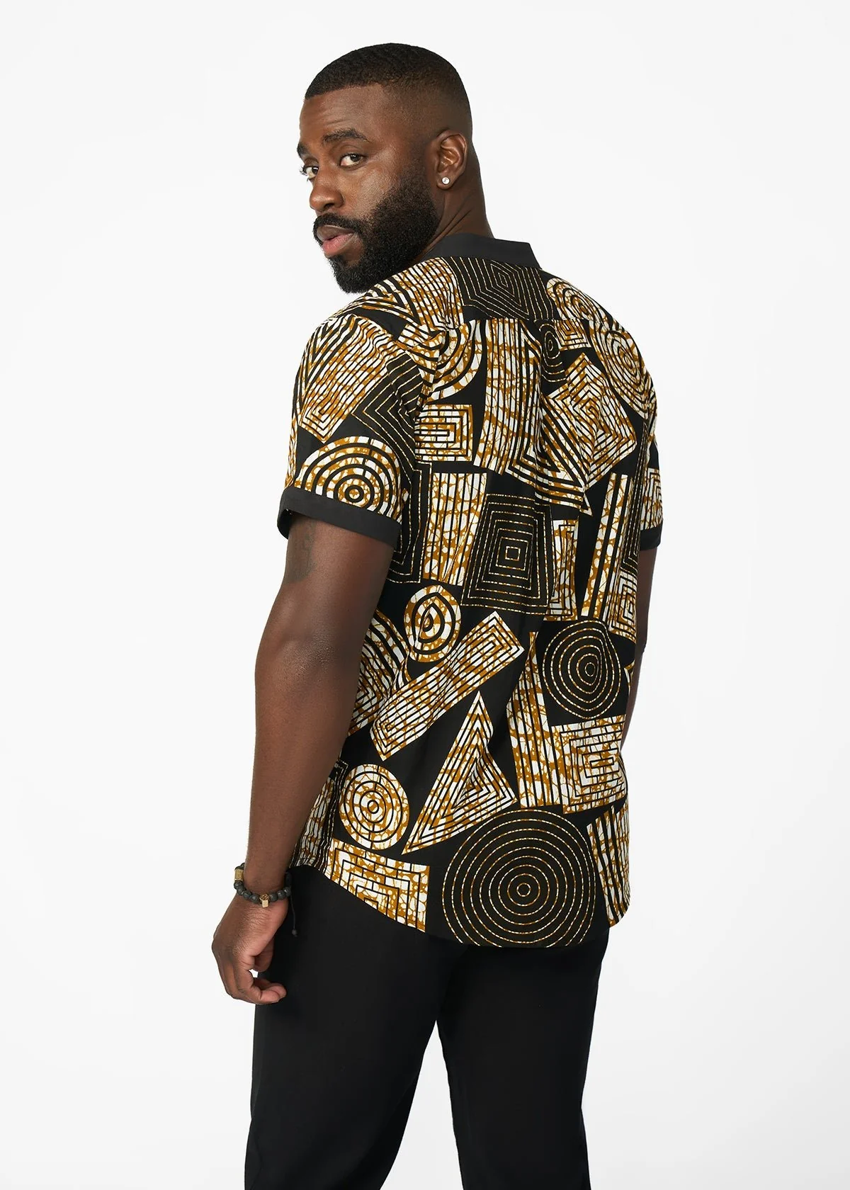 Our unique Olu Button-Up in Black Brown Geometric is perfect for the modern man interested in looking stylish while incorporating African print.